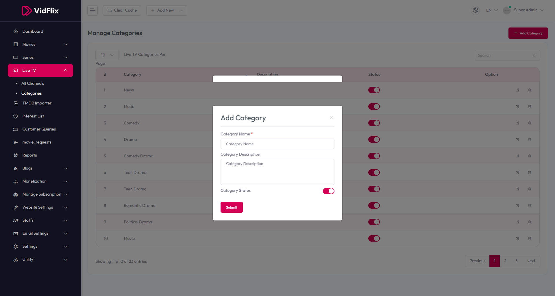- Category Status – Toggle to enable or disable the category status.