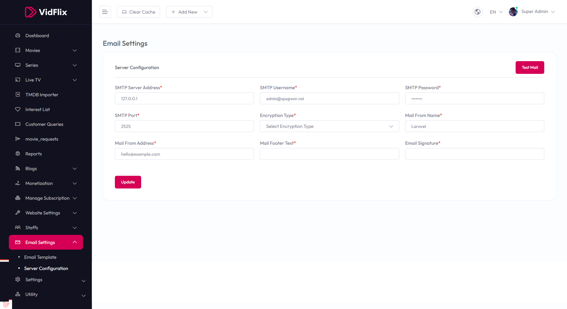 After entering the details, click the Update button to save settings. Use the Test Mail button to verify the configuration.