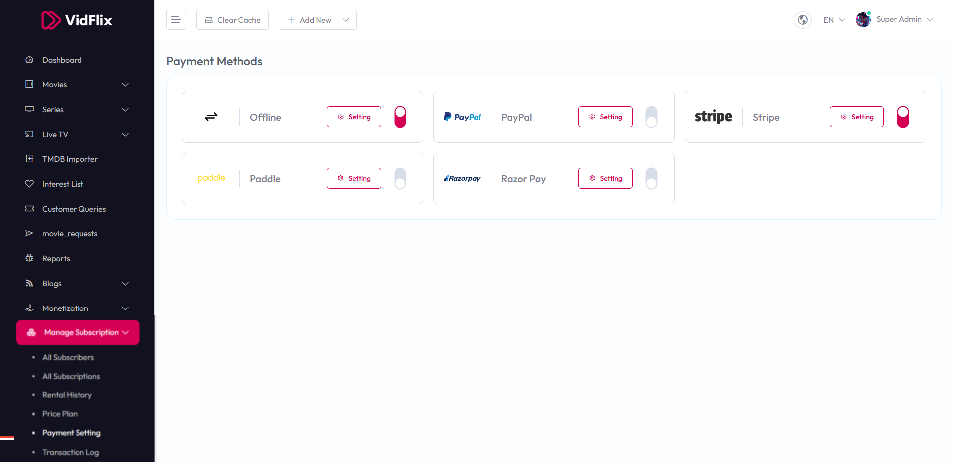 - Razor Pay – Toggle to enable or disable Razor Pay payment method.