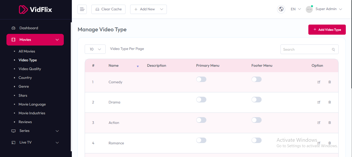 - Name – Shows the name of the video type (e.g., Comedy, Drama).